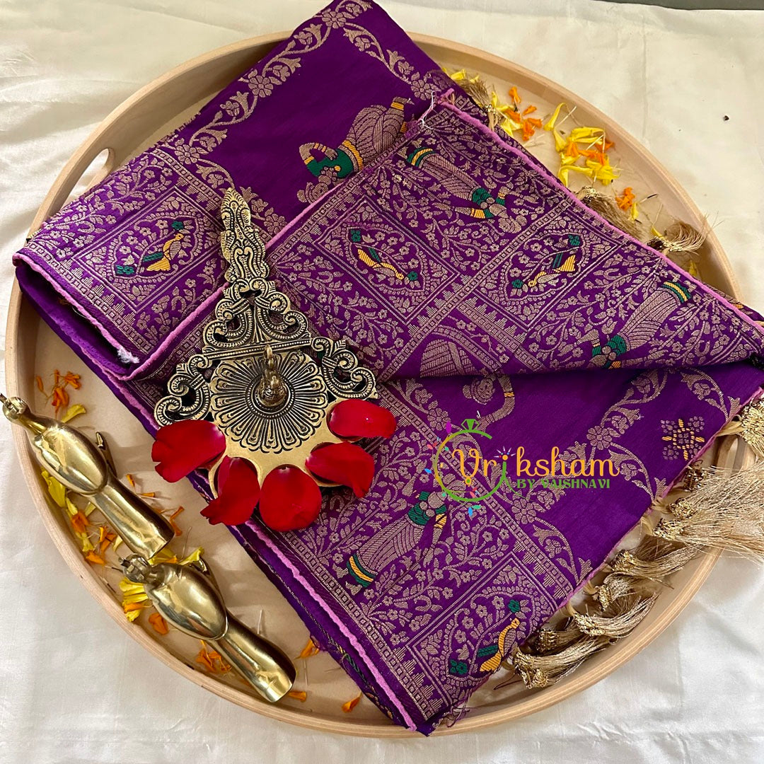 Purple Semi Benarasi Saree -Kattam – Festive wear saree –Embroidery work throughout the saree; comes with Blouse attached. Two side traditional border.