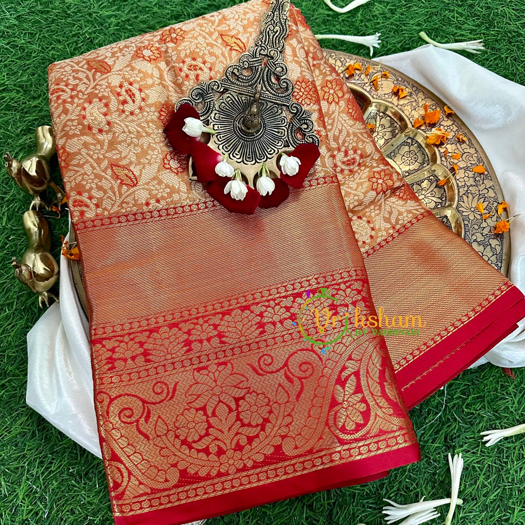 Semi Benarasi Saree Festive wear saree –self work throughout the saree; comes with Blouse attached. Contrast two side border and pallu - one side bigger border.