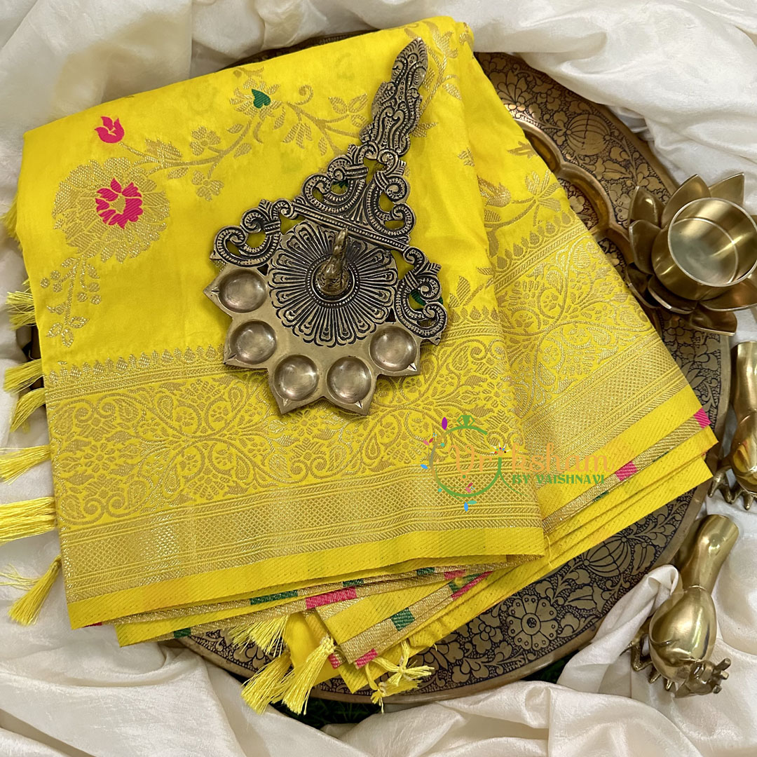 Semi Benarasi Saree – Festive wear saree –Embroidery like design work throughout the saree; comes with Blouse attached. Two side traditional border.