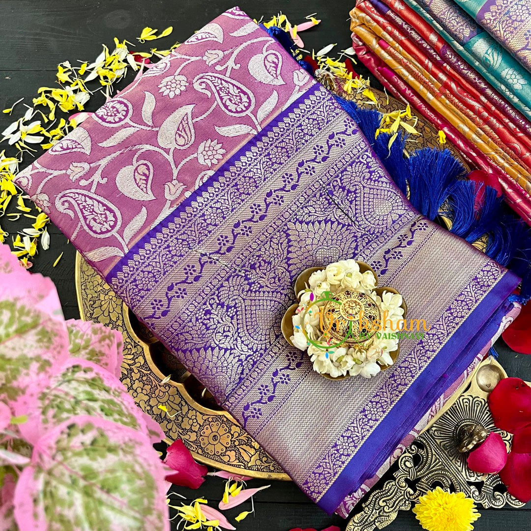 Purple with Blue Semi Benarasi Saree- Festive wear saree –silver like work throughout the saree; comes with Blouse attached. Two side border and pallu.