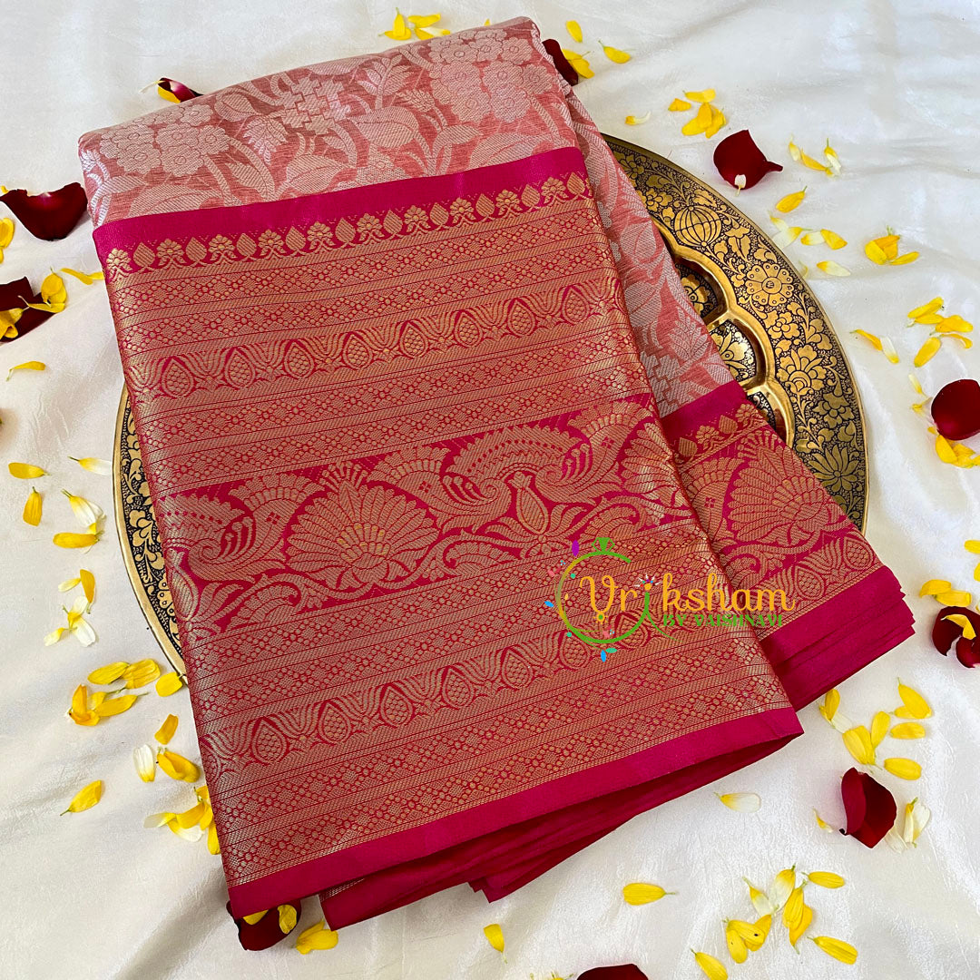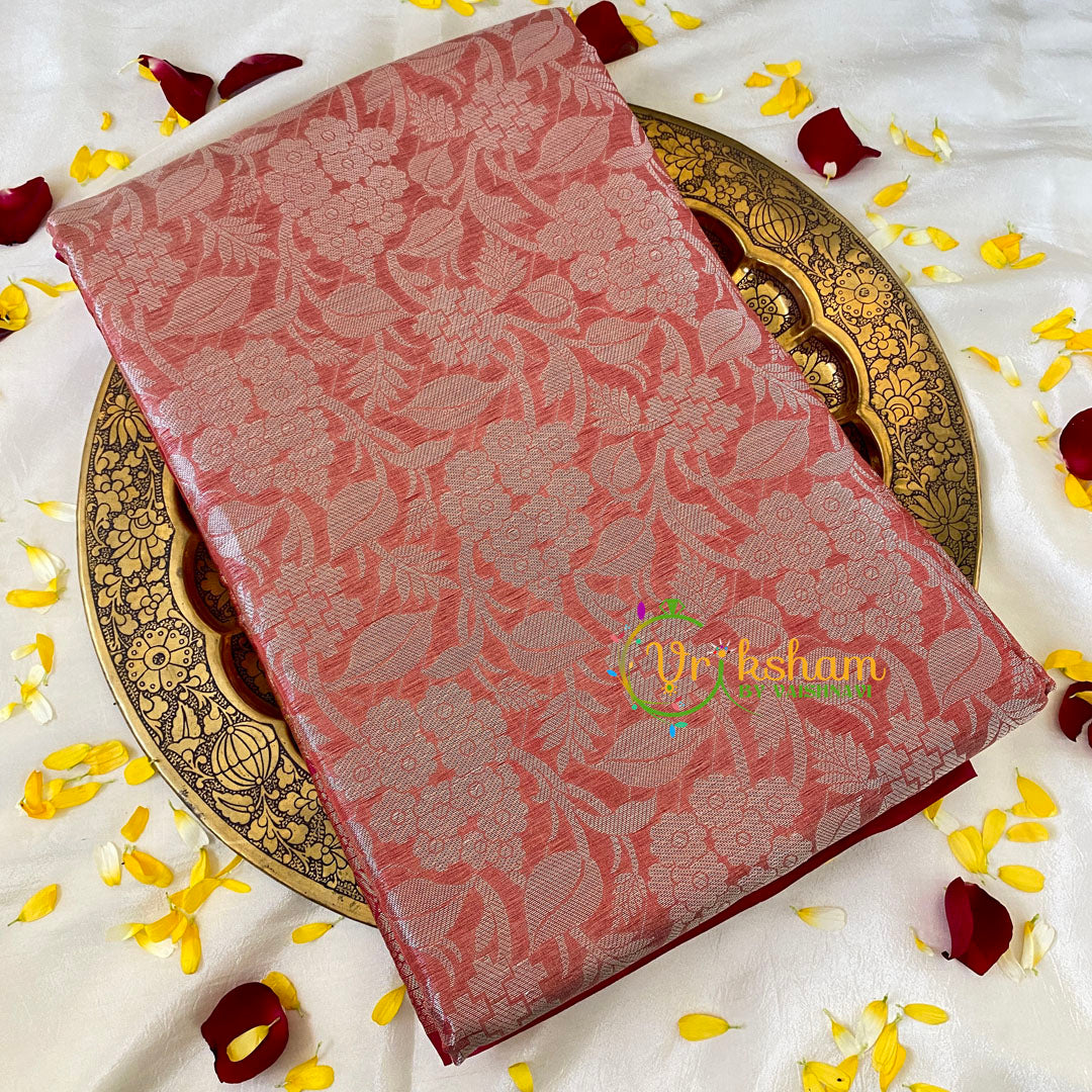 Soft Maroon Semi Benarasi Saree Festive wear saree –self work throughout the saree; comes with Blouse attached. Contrast two side border and pallu - one side bigger border.