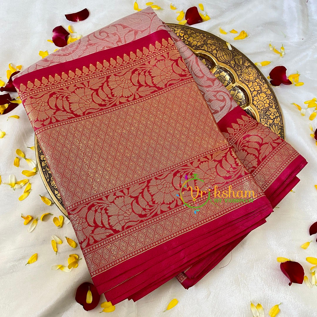 Soft Maroon Semi Benarasi Saree Festive wear saree –self work throughout the saree; comes with Blouse attached. Contrast two side border and pallu - one side bigger border.