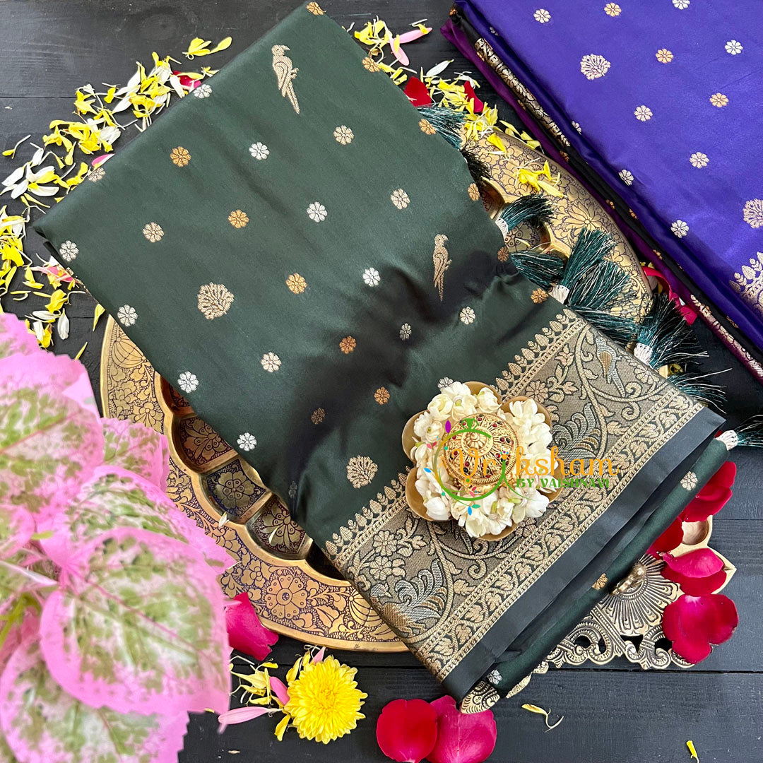 Green Semi Soft Silk Saree- Festive wear saree –Dual color Butta, peacock and parrot Pattern throughout the saree; comes with Blouse attached. Two side border and pallu.