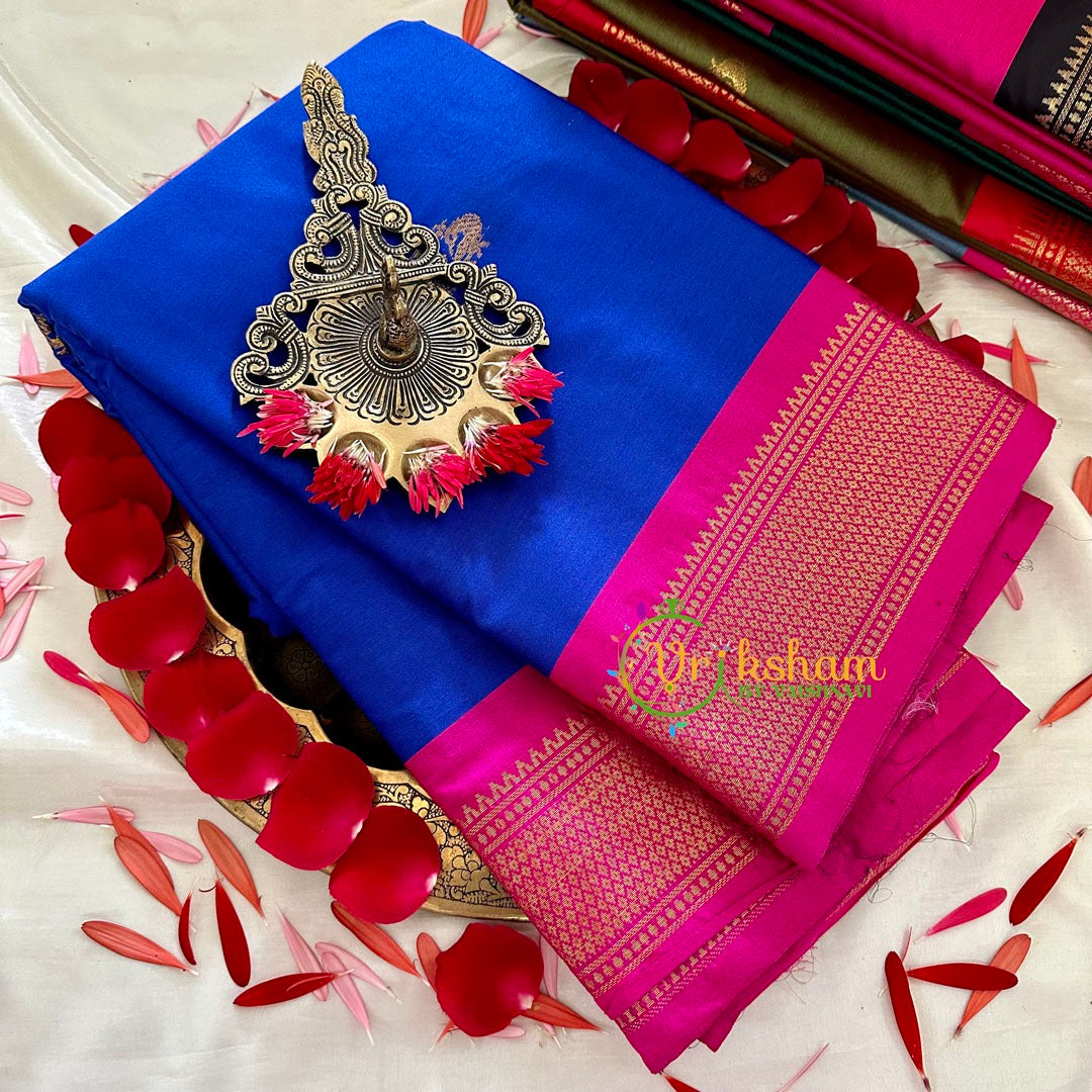 Royal Blue with Pink Border Semi Soft Silk Saree – with traditional border –Small Mayil Butta Pattern throughout the saree; comes with Blouse attached. Two side same size contrast border.