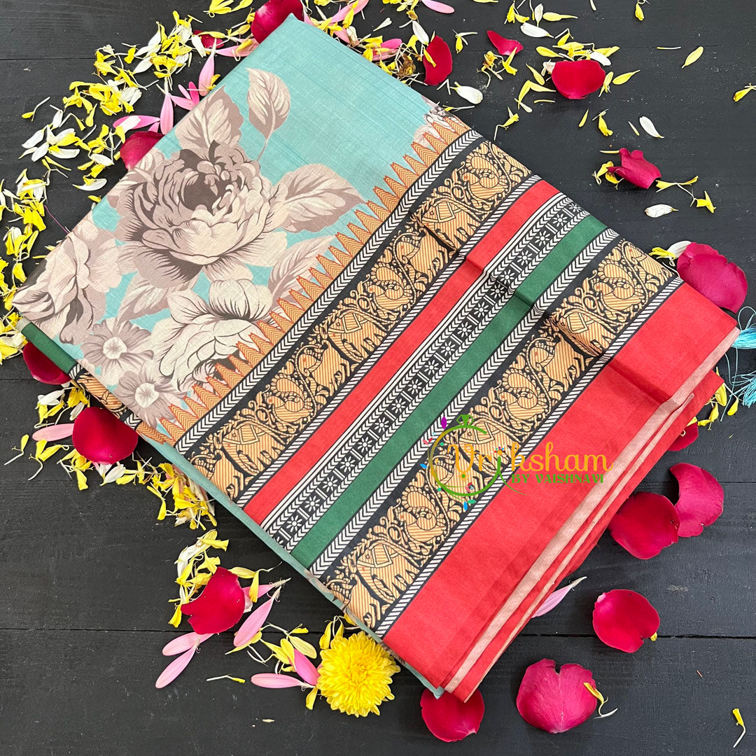 Pastel Blue Semi Tussar Pastel Floral Saree- Party wear saree – Pattern throughout the saree; comes with Blouse attached. One side bigger border; other side small border and pallu.