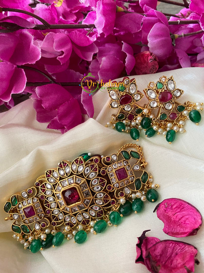 Semi Precious Kemp High Neck Choker – predominantly Red, White stones and green. Gold look alike, floral pattern stone studded, pearl and Green Bead finish. Comes with a pair of earrings.