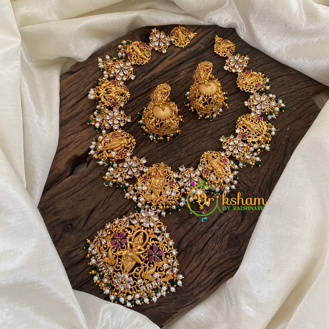 Shri Vishnu Dasavathar Neckpiece with Narasimha Pendant-AD Stone Temple Har – dasavatharam of vishnu depicted idol Temple Neckpiece, comes with matching ear hangings. Green bead Finish.