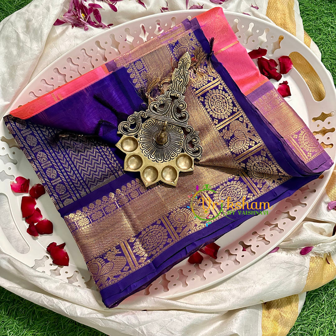 Rose Pink Mayil Kattam Silk Cotton Saree - Plain Festive wear saree ; comes with Blouse attached. Two side contrast border and pallu.