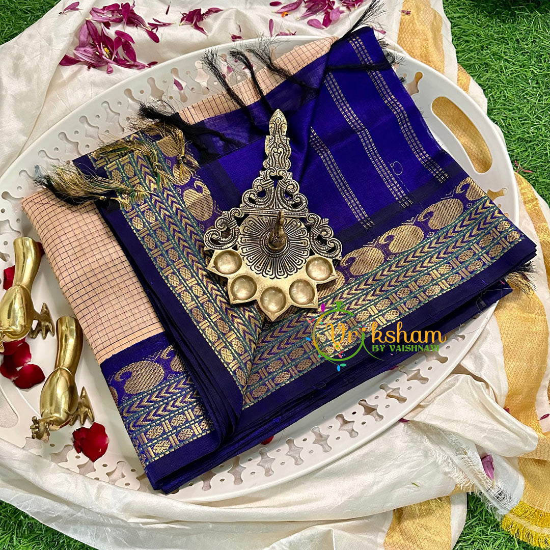 Sandal with Blue Podi Kattam Silk Cotton Saree - Festive wear saree ; comes with Blouse attached. Two side contrast border and pallu.