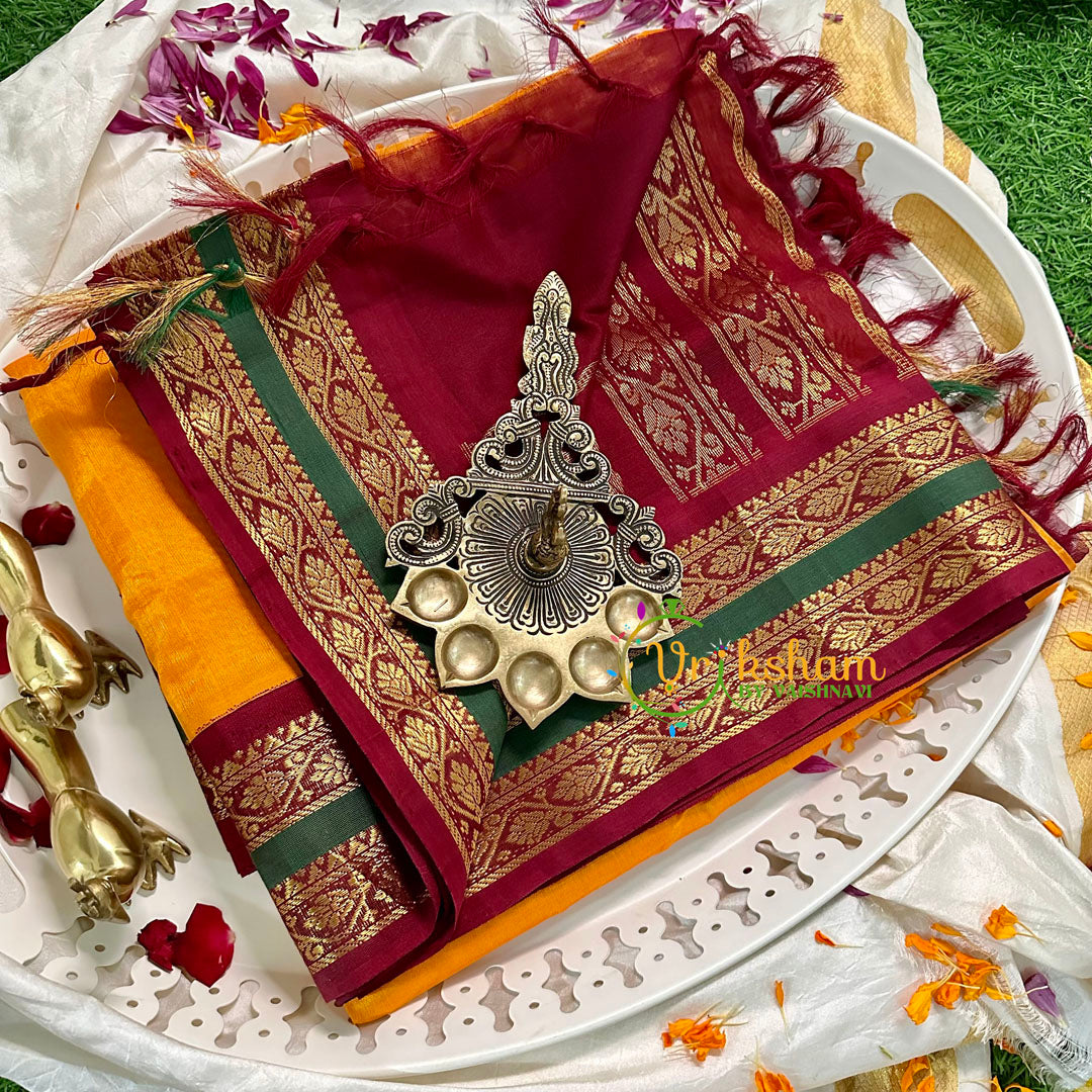 Mango Yellow with Maroon Green Silk Cotton Saree - Plain Festive wear saree ; comes with Blouse attached. Two side contrast border and pallu.