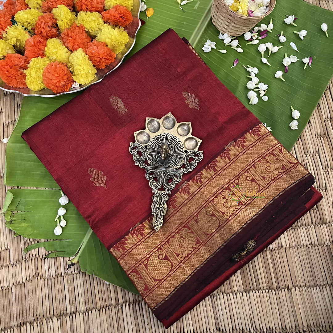 Pleasant Red Silk Cotton Saree - Small Butta Festive wear saree ; comes with Blouse attached. Two side contrast border and pallu.