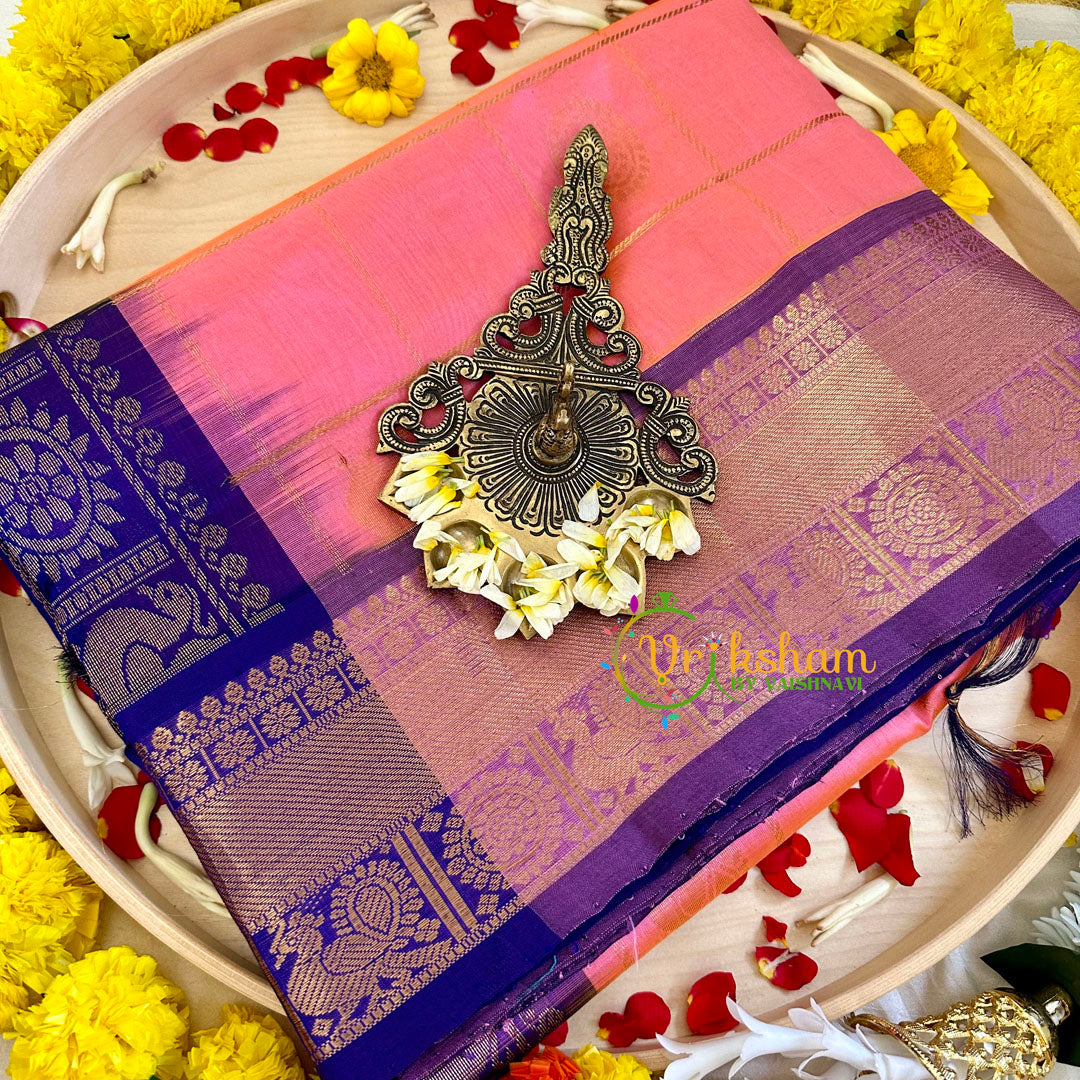 Peach Pink Mayil Kattam Silk Cotton Saree - Kattam and checks Festive wear saree ; comes with Blouse attached. Two side contrast border and pallu.