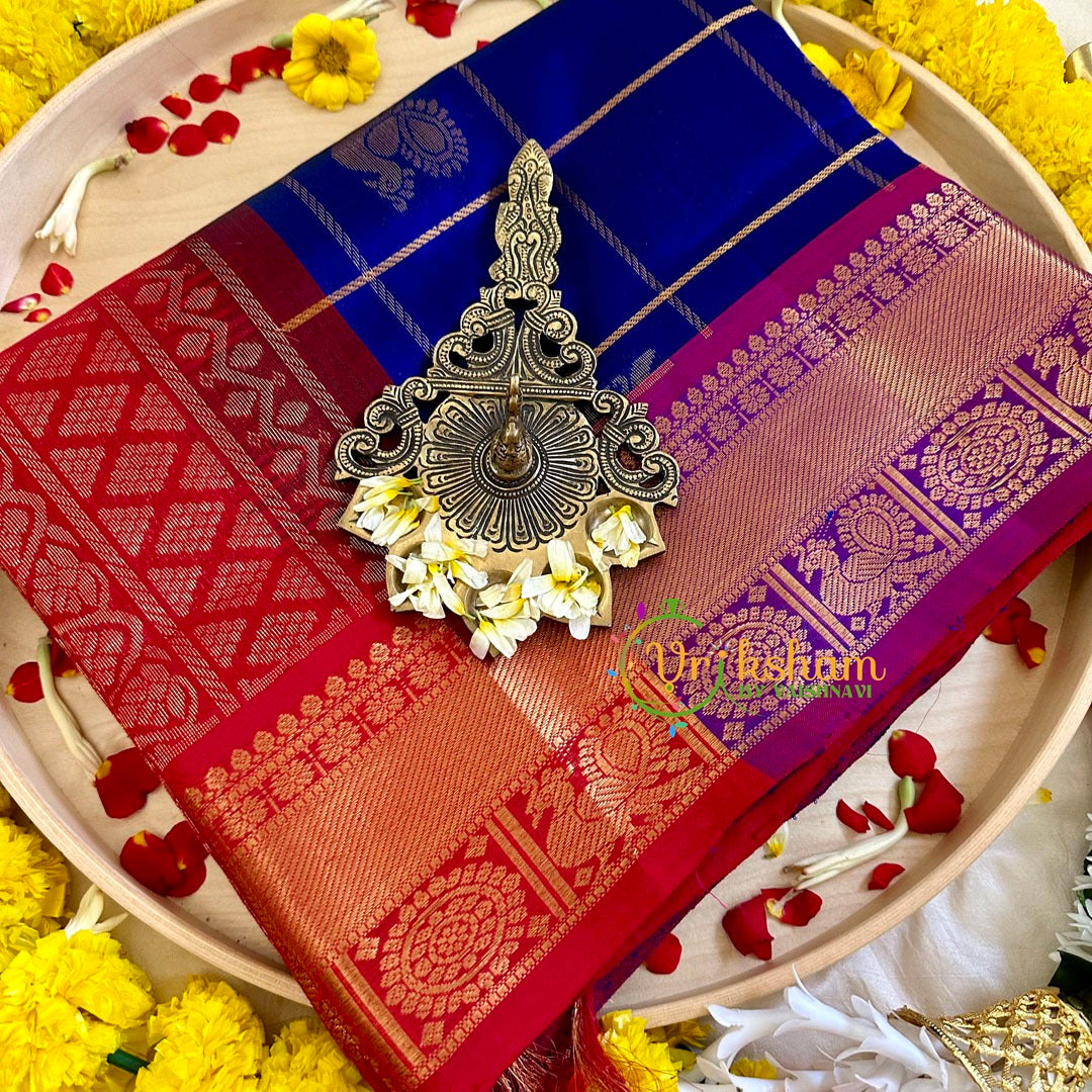 Royal Blue Mayil Kattam Silk Cotton Saree - Kattam and checks Festive wear saree ; comes with Blouse attached. Two side contrast border and pallu.