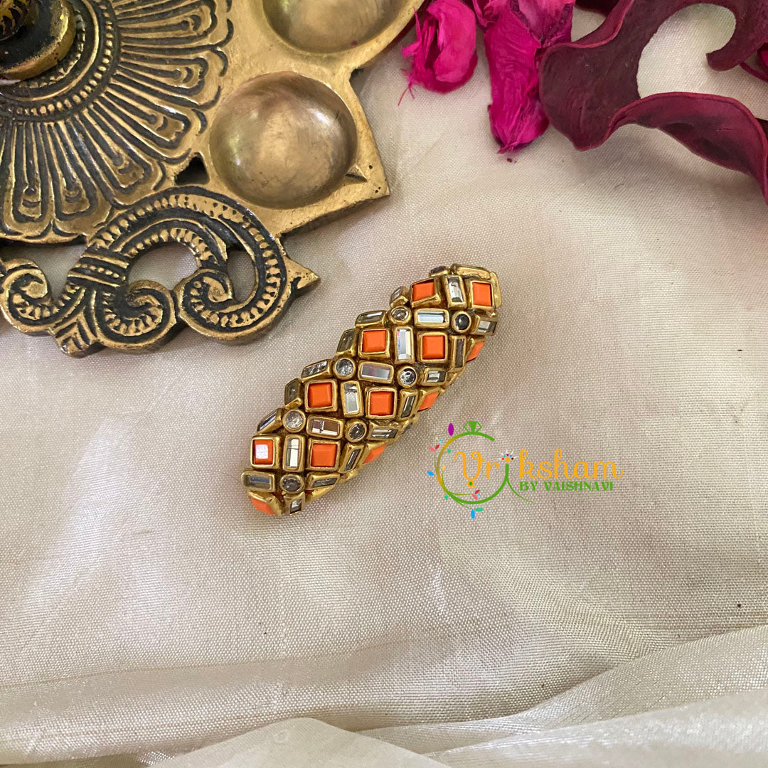 Silk Thread Kundan Saree Pin -Orange White -Dots and Lines-G9243