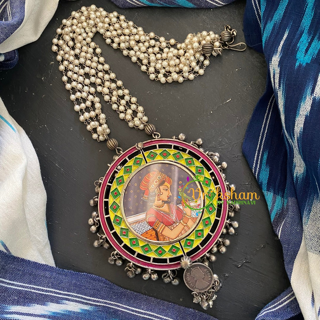 Silver Afghani Neckpiece with Pendant–Princess with Parrot HAND PAINTED pendant neckpiece; layered pearl long chain. ONLY NECKPIECE.