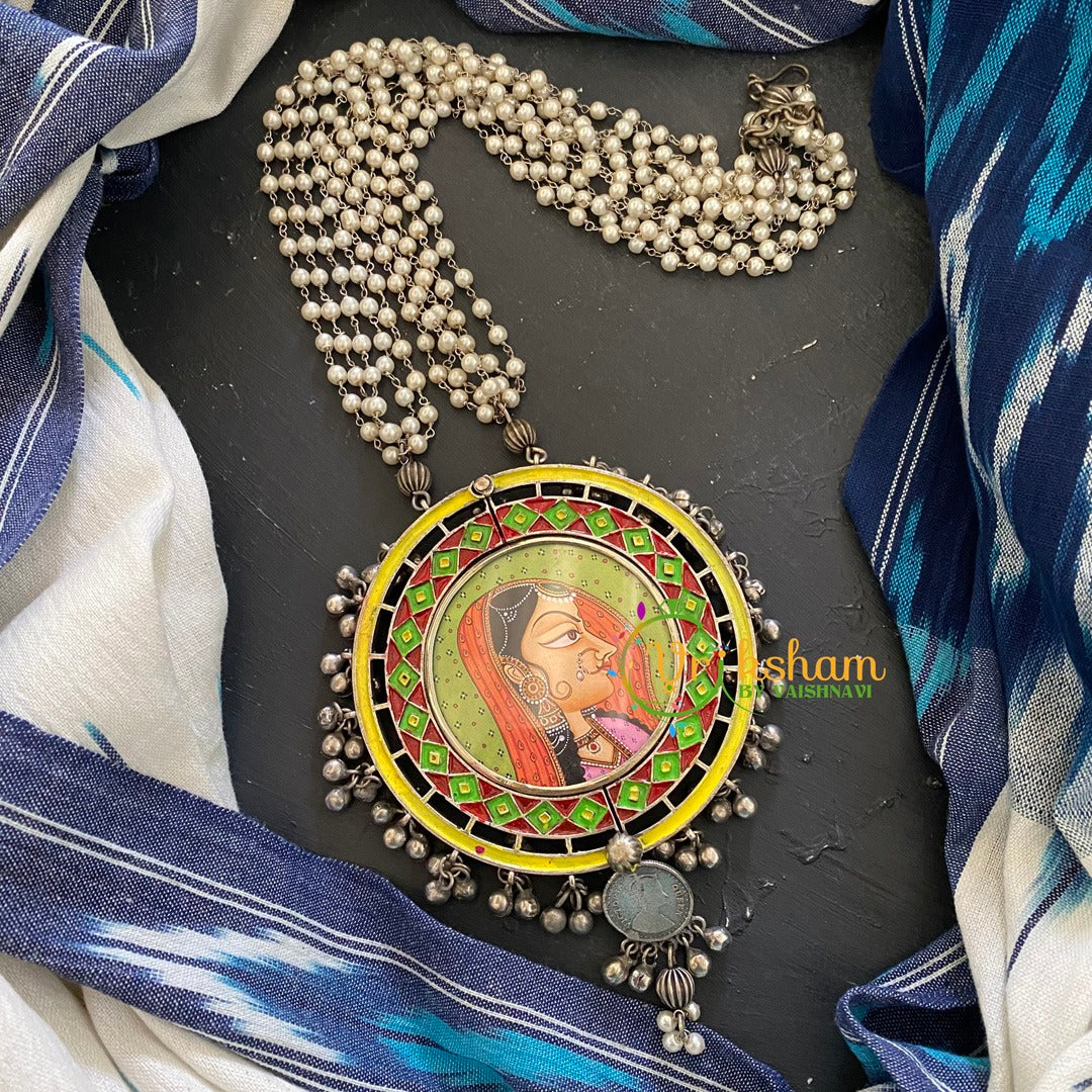 Silver Afghani Neckpiece with Pendant–Princess side face HAND PAINTED pendant neckpiece; layered pearl long chain. ONLY NECKPIECE.