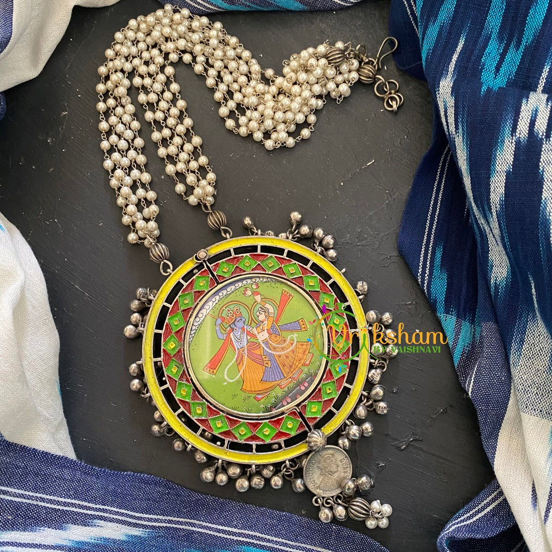 Silver Afghani Neckpiece with Pendant–Dancing Krishna couple HAND PAINTED pendant neckpiece; layered pearl long chain. ONLY NECKPIECE.