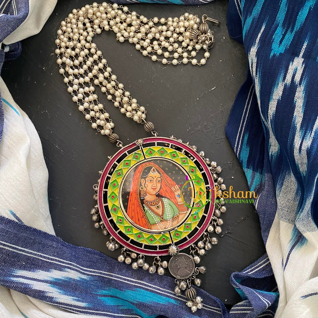 Silver Afghani Neckpiece with Pendant–Princess holding veil HAND PAINTED pendant neckpiece; layered pearl long chain. ONLY NECKPIECE.