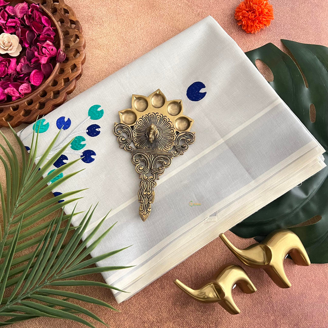 Introducing our Silver Color Kasavu Tissue Cotton Saree, hand embroidered with stunning contrast colour flowers and a silver border. Elevate your look with this exclusive and elegant saree, perfect for any occasion. Made with premium quality materials, it is the epitome of luxury and craftsmanship.