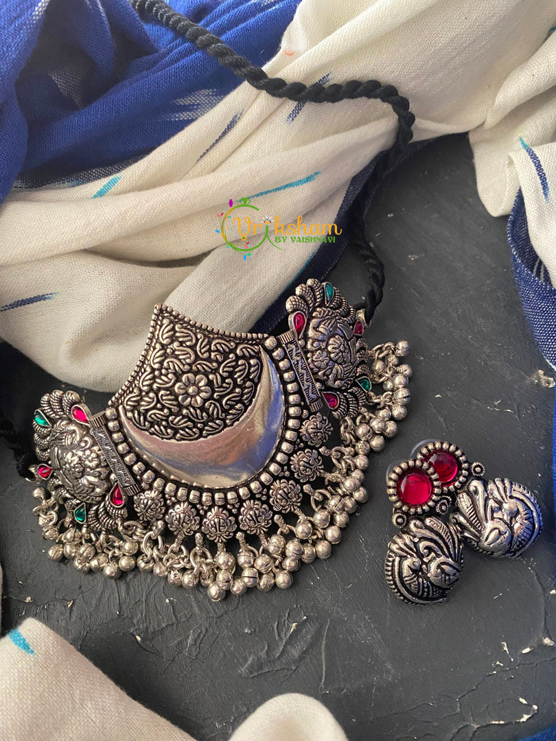 Silver High Neck Choker-Chandh - Silver look alike polish, black back rope; neckpiece with pinkish red and green kemp stones, comes with matching studs.