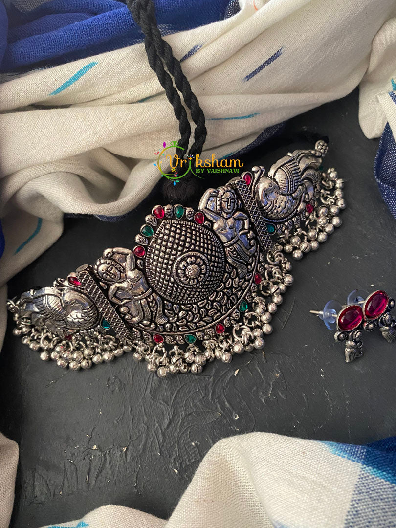 Silver High Neck Choker - Tilak with dancing Girls -Silver look alike polish, black back rope; peacock pattern neckpiece with pinkish red and green kemp stones, comes with matching studs.