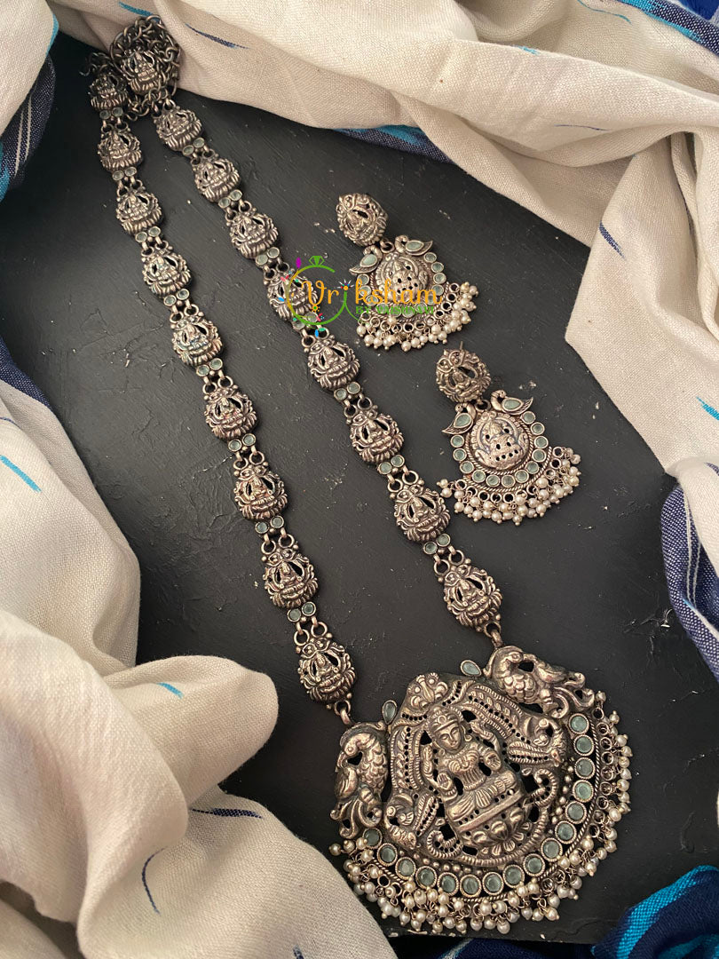 Oxidized German Silver Lakshmi Haram -Temple Haram Green color stone studded-Silver look alike jewelry; one of a kind neckpiece with adjustable black back rope.