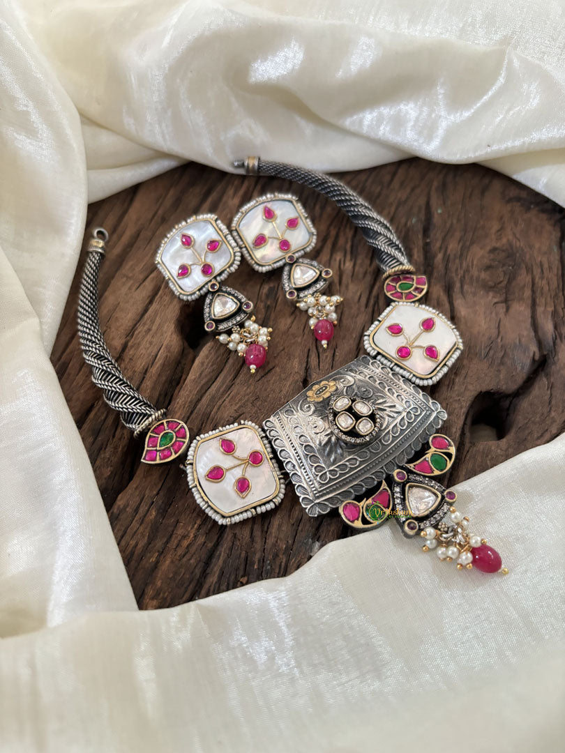 Statement Silver Look Alike Hasli with Pendant– semi precious kundan stones jadau work designer pendant.