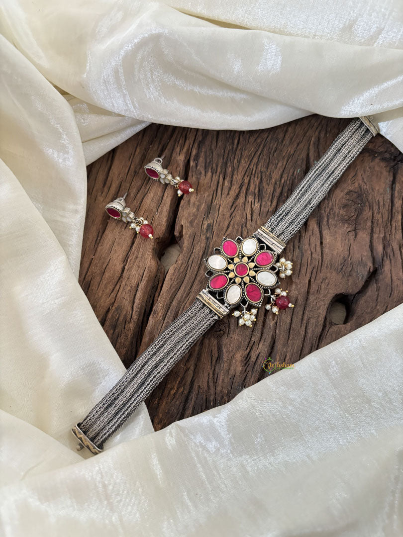 Silver Look Alike Jadau Kundan High Neck Choker - Neckpiece and Earrings - premium quality polish and semi precious stones - hand made by our artisans, boasts the design and quality of a real silver choker (but not silver) at an affordable price.