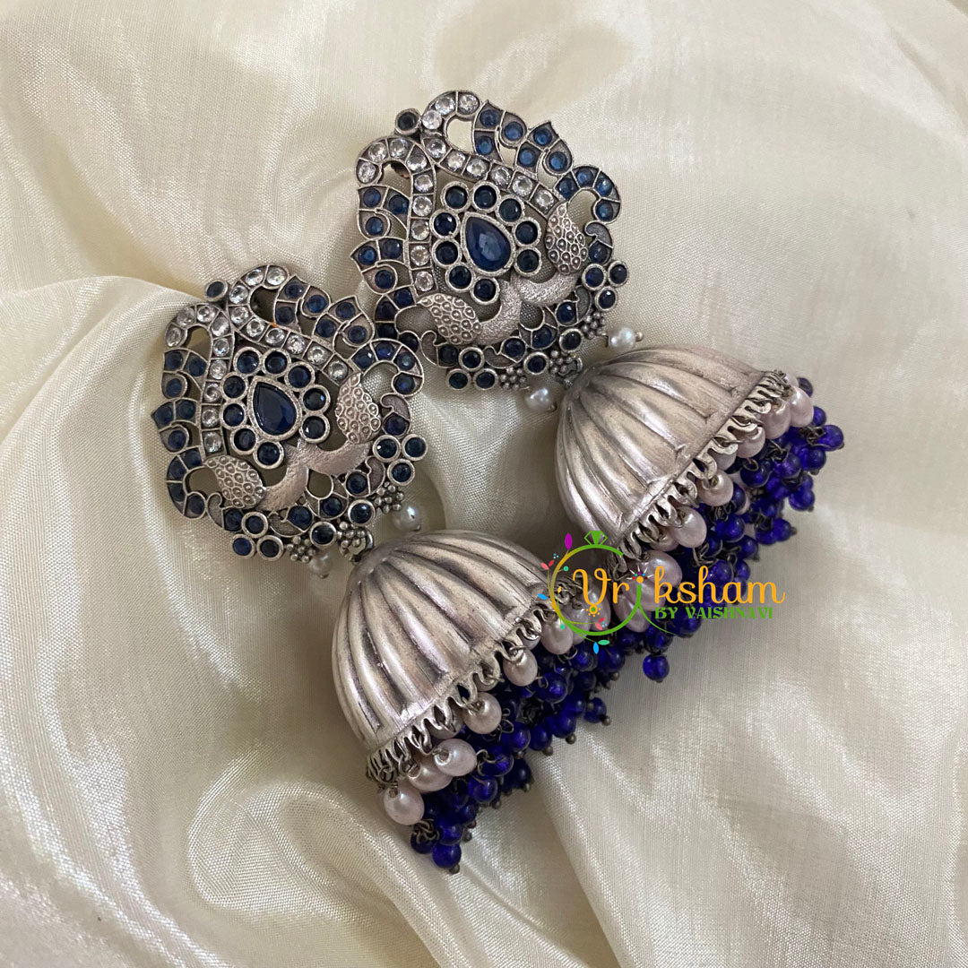 Blue Stone Silver Look Alike Jhumkas -Jumbo Jhumkas -stone studded german silver look alike jhumkas with pearl finish.