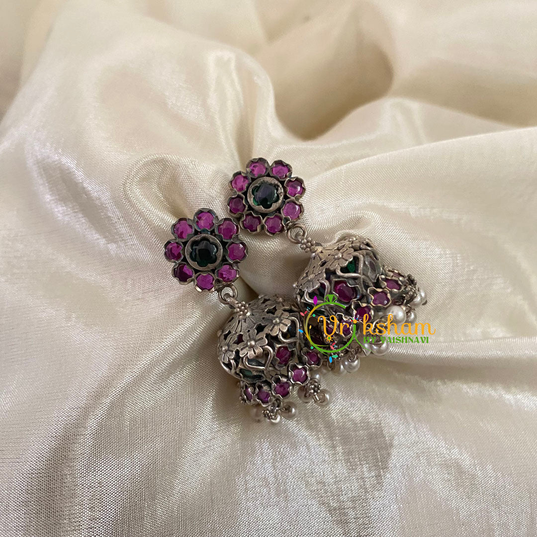 Silver Look Alike Jhumkas -Pink Green stone studded floral german silver look alike jhumkas with pearl finish.