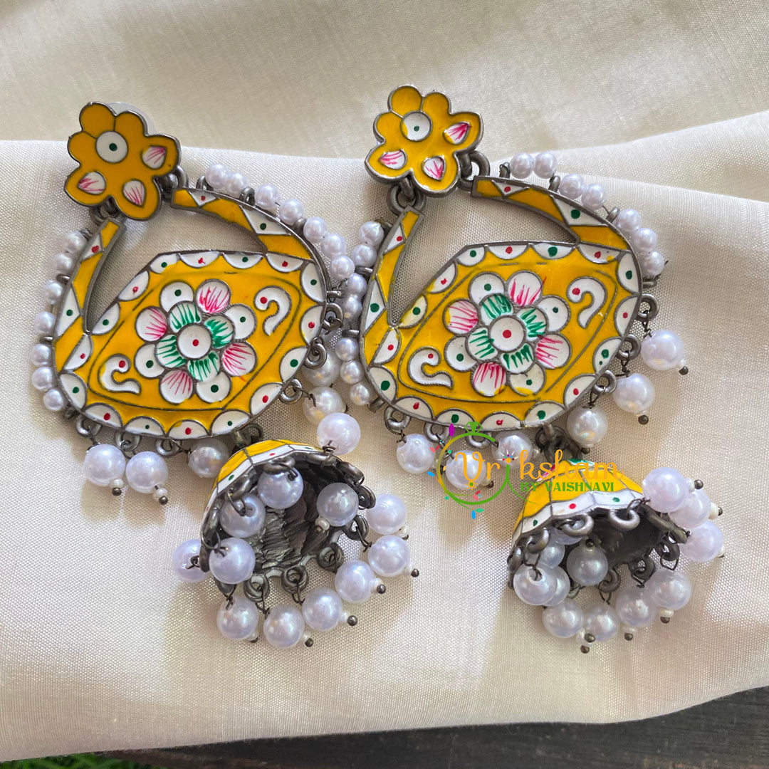 Silver Look Alike Meenakari Dangler Jhumkas-Yellow-hand painted enamel earring with pearl finish.