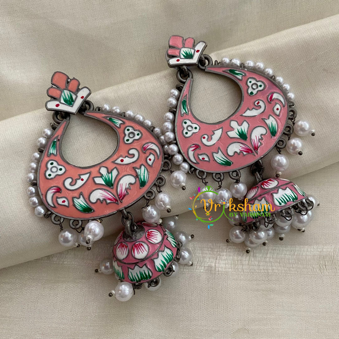 Silver Look Alike Meenakari Dangler Jhumkas-Orangish Pink-hand painted enamel earring with pearl finish.