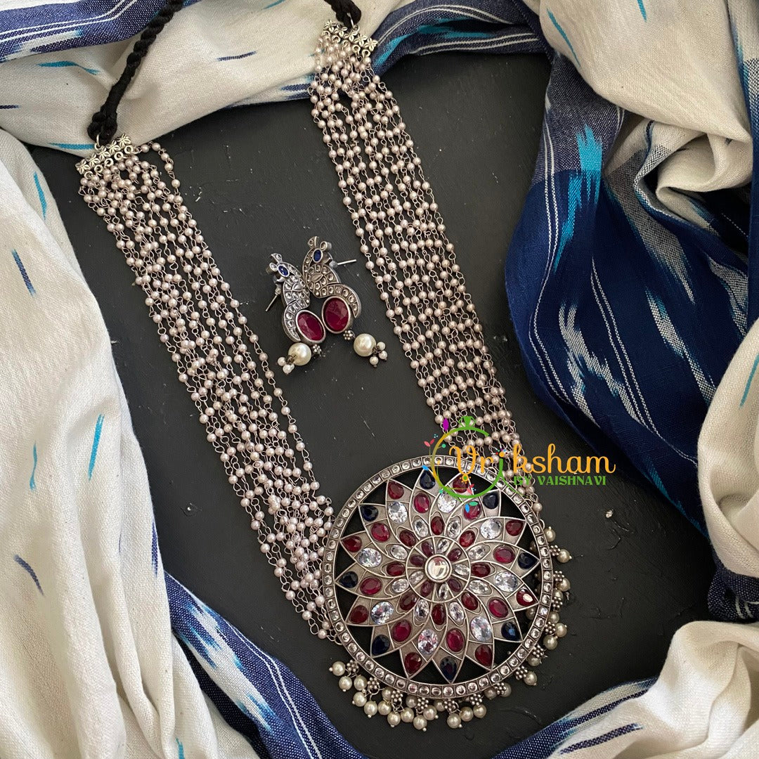 Silver Look Alike Pearl Mala with Pendant -Red Green AD stone studded round pendant with floral pattern and pearl finish.