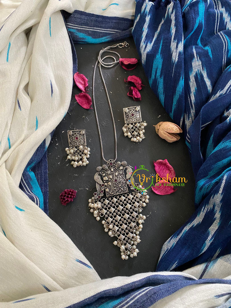 Silver Look Alike Pendant Chain Neckpiece-Red White Stone– oxidized german silver penant and chain; comes with matching earrings.