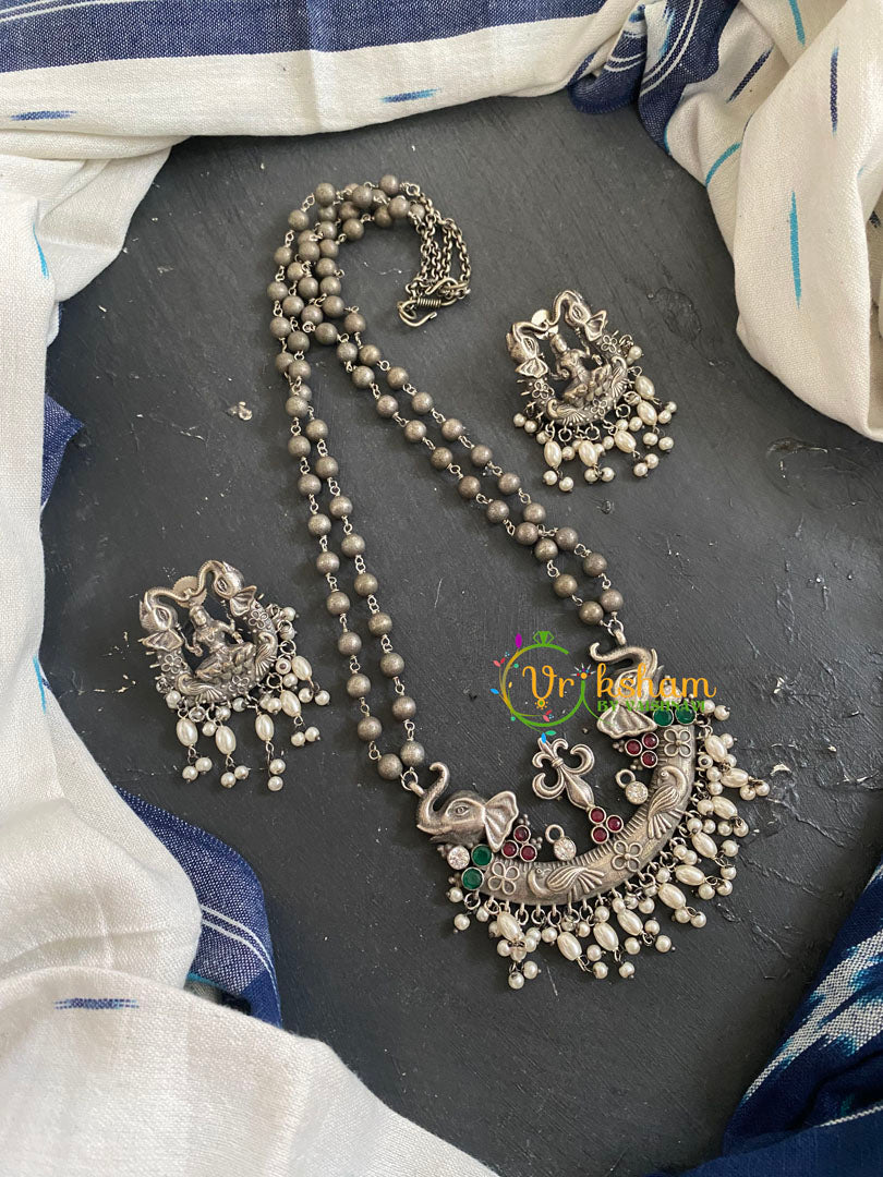 Silver Look Alike Pendant Chain Neckpiece - statement pendant - a mid length neckpiece. Comes with matching studs. For similar neckpieces visit, https://vrikshamindia.com/product-category/silver-jewellery Color, shades, texture displayed may slightly vary from...