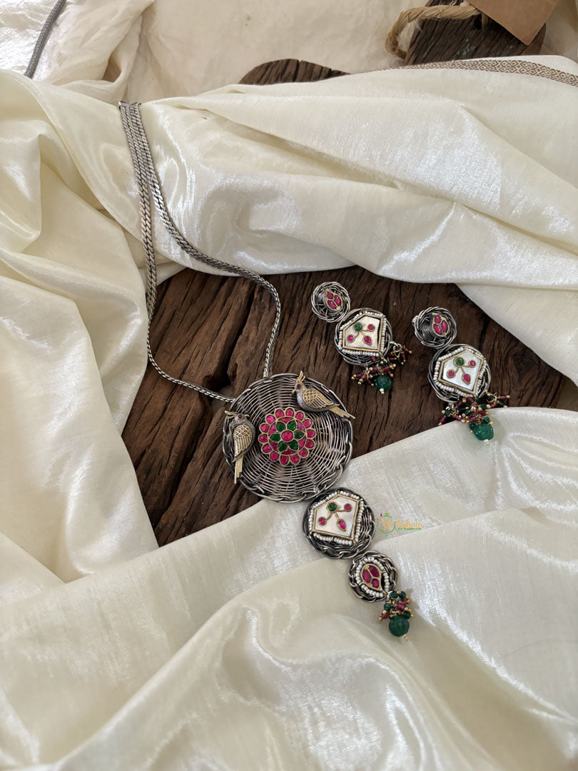 Silver Look Alike Statement Jadau Kundan Pendant Chain Neckpiece –semi precious kundan stones jadau work designer pendant and earrings