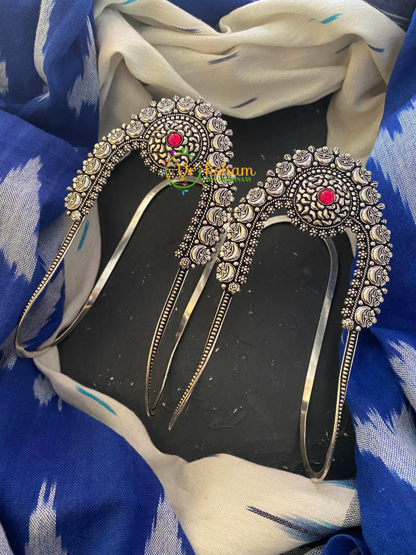 Silver Look Alike Traditional Vangi – Kolhapuri make, centre stone studded pattern; one of a kind silver look alike armlet.