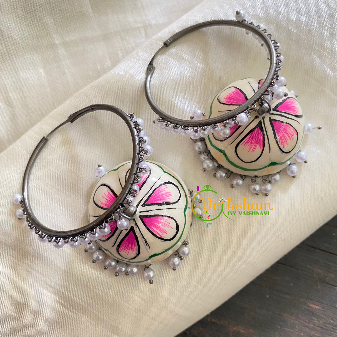 Silver Meenakari Jhumkas -Loop Ring with Jhumka-White-and Pink -Silver Look alike Loop jhumkas withhand painted hangings. Light weight meenakari work.