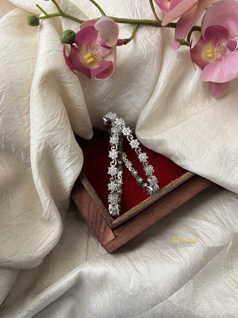 Silver Plated Antique Flower Diamond Bangle Set - White - AD Stone Studded festive Bangles set. comes as pair only.