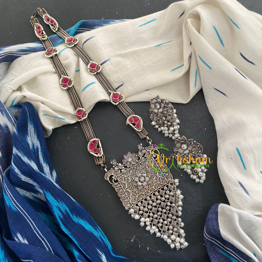 Oxidized German Silver Statement Pendant Neckpiece - with Red stone studded along length of the chain and ghungroo pearl finish geometric pendant.