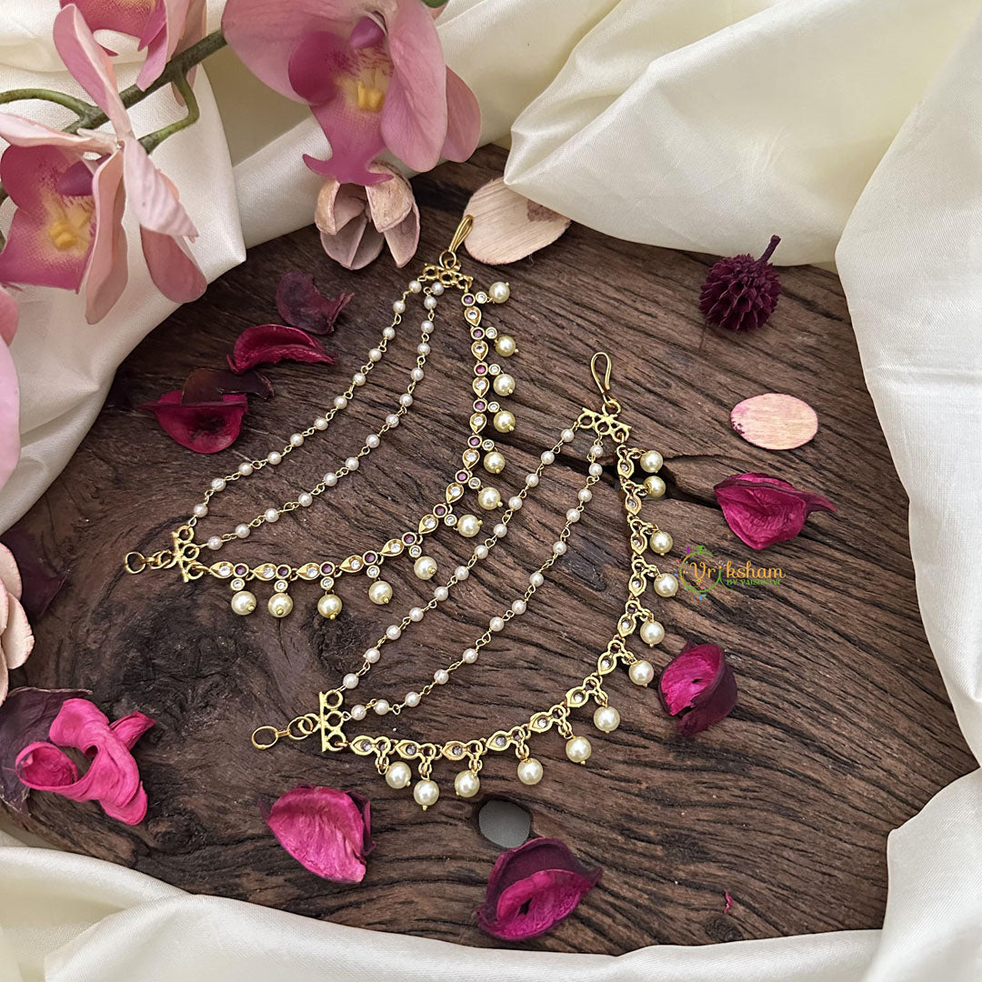Indulge in sophistication with our Simple AD Stone 3 layered Maatil earchain. Adorned with stunning ad stones, this piece exudes luxury and elegance. Three layers provide a unique and refined touch, making it a perfect addition to any outfit. Elevate your style with this exclusive piece.
