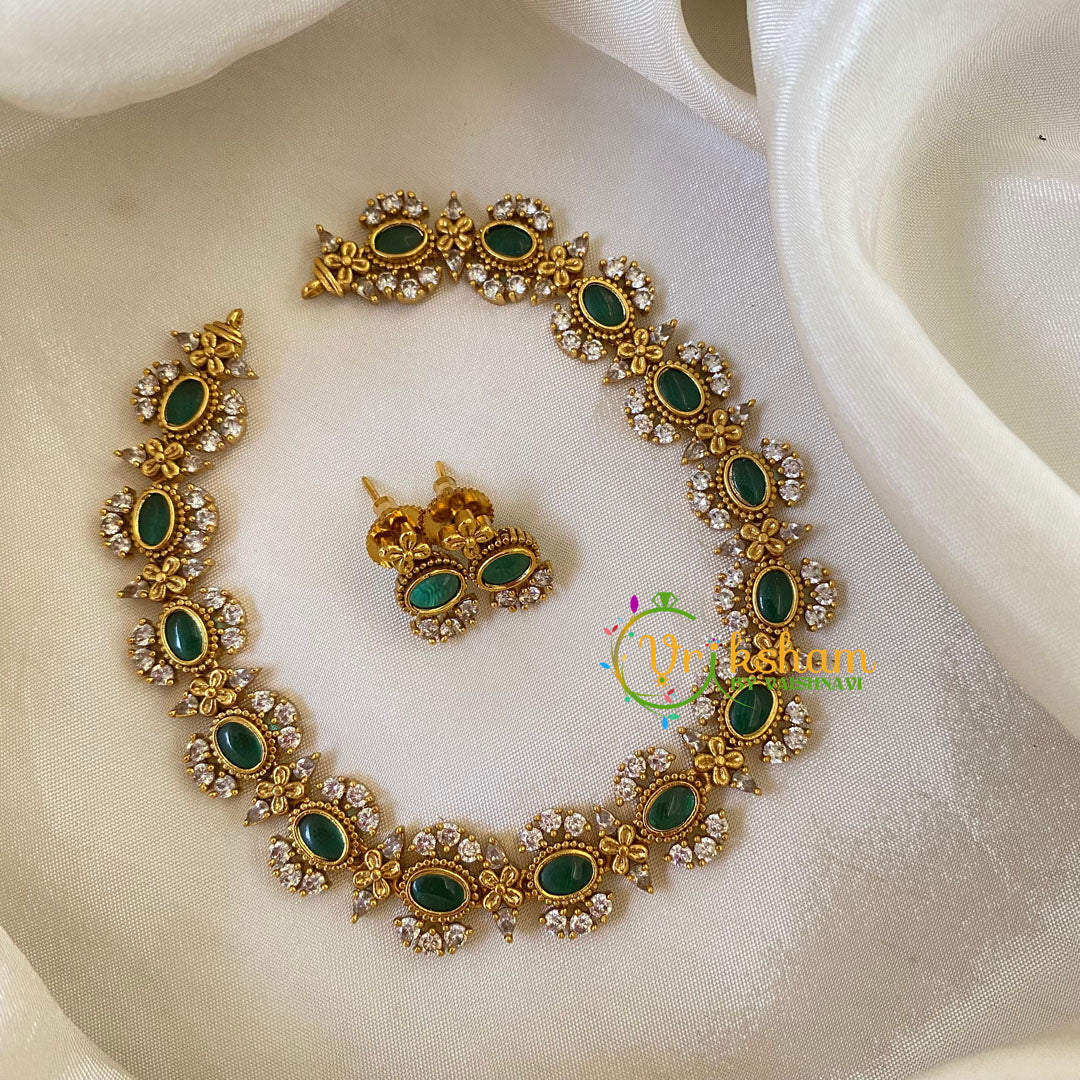 Simple AD Stone Choker Short Neckpiece-Green white AD stone flower patterned choker with earrings.