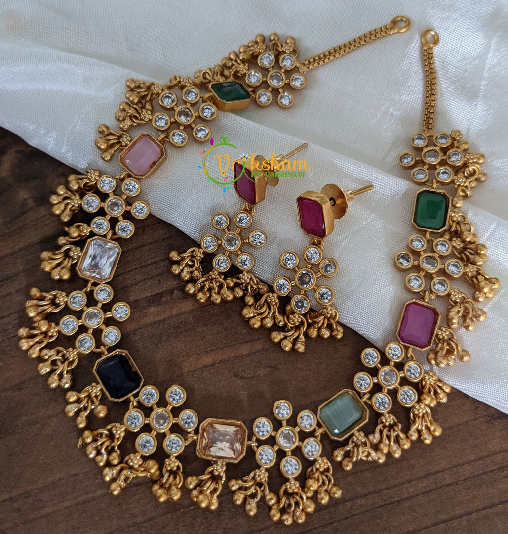 Simple AD Stone Choker -Multicolor geometrical stones arranged with floral interludes with earrings and ghungroo finish.