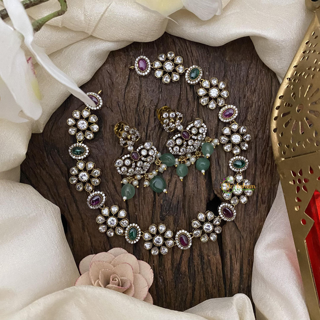 Elevate your look with our Simple Floral Victorian Diamond Choker. The white floral design and vibrant red and green accents add an elegant touch to any outfit. Featuring delicate diamonds, this choker is perfect for any occasion and will make you stand out from the crowd. Comes with matching earrings.