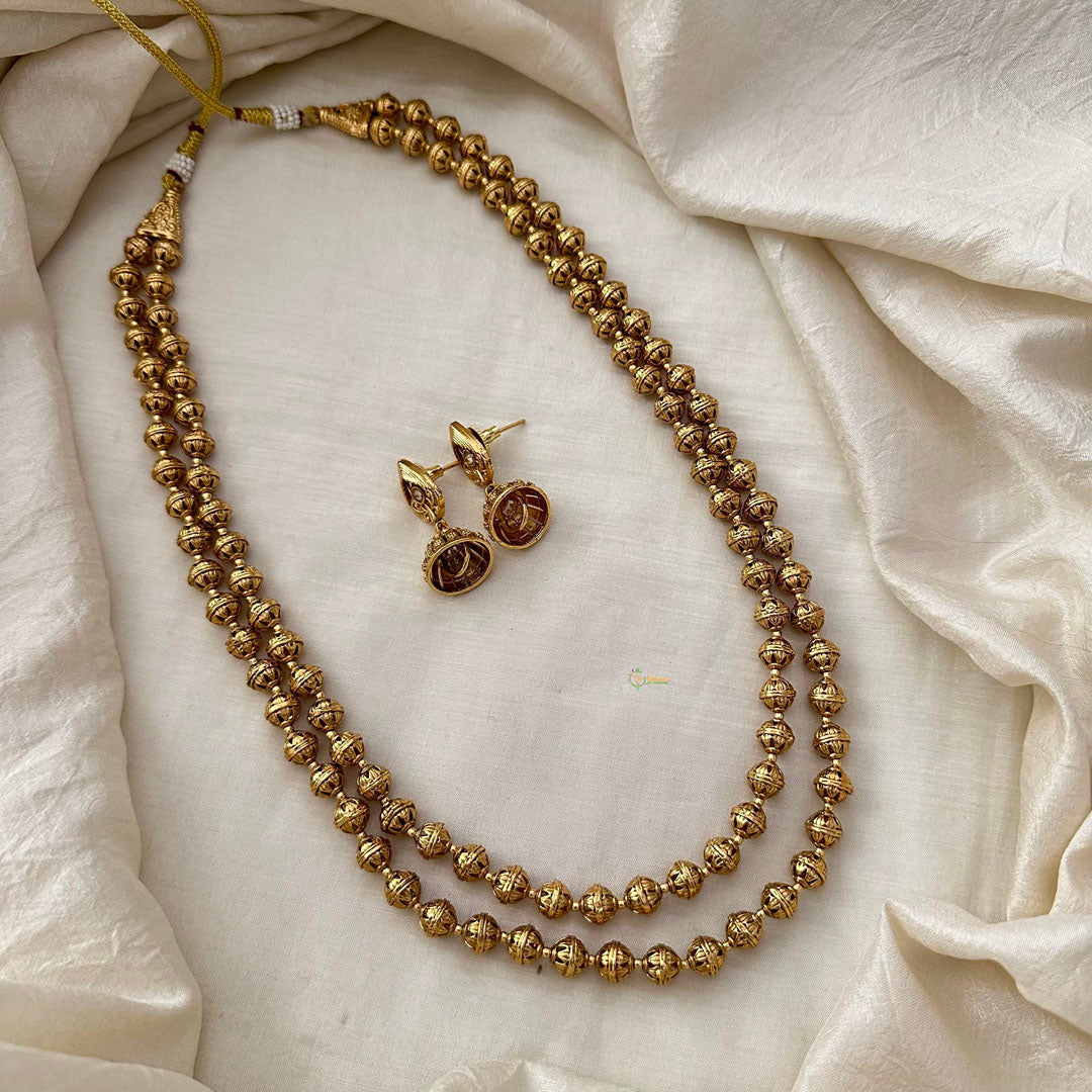 Indulge in luxury with our Gold Look Alike Beaded Malai, featuring two layers for an elegantly layered look. The intricate beadwork adds a touch of opulence to any outfit. Complete the ensemble with matching earrings for a truly exclusive and timeless appeal.