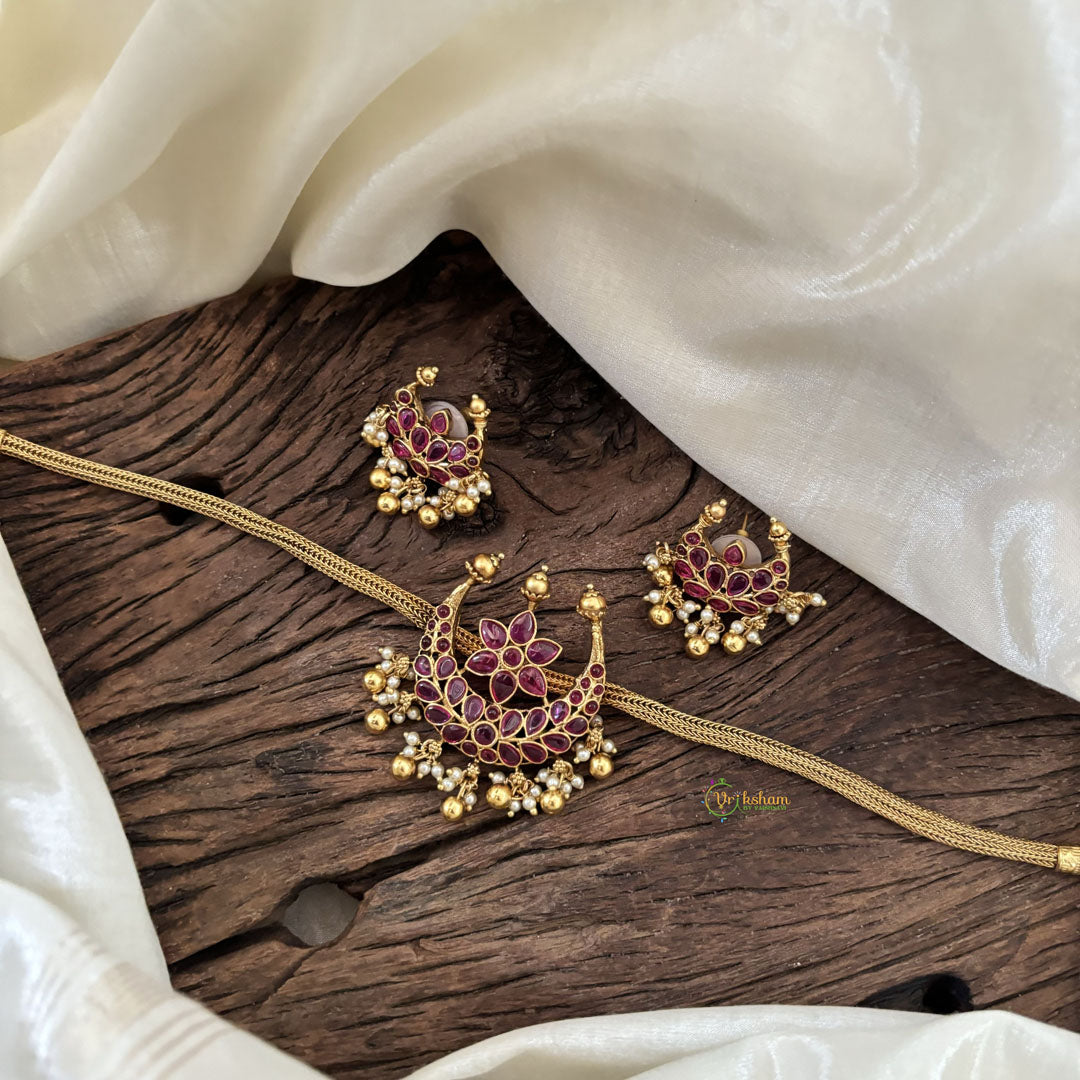 Simple Half Moon Pendant High Neck Choker-Red AD stone studded premium quality high neck choker; gold bead finish . Comes with matching ear hangings.