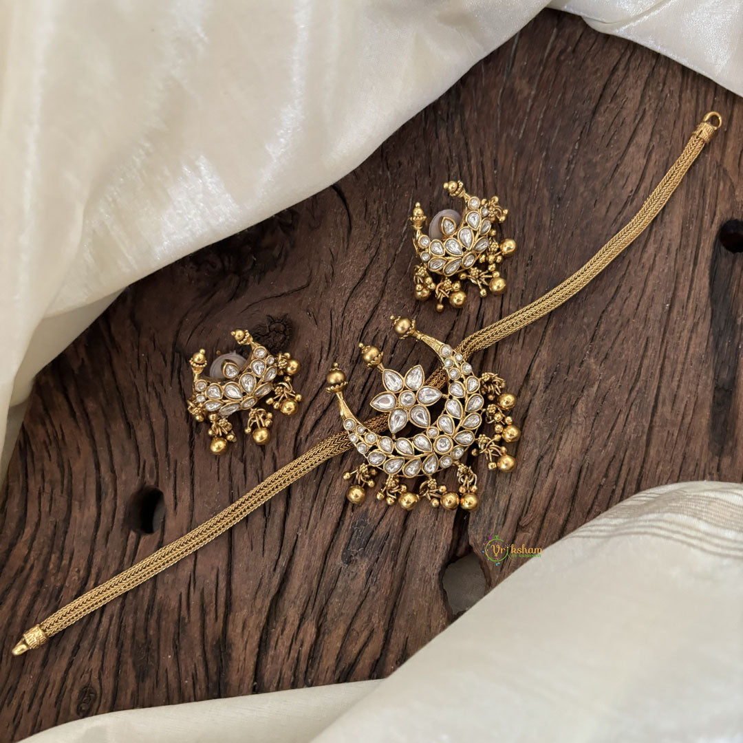 Simple Half Moon Pendant High Neck Choker -White AD stone studded premium quality high neck choker; gold bead finish . Comes with matching ear hangings.