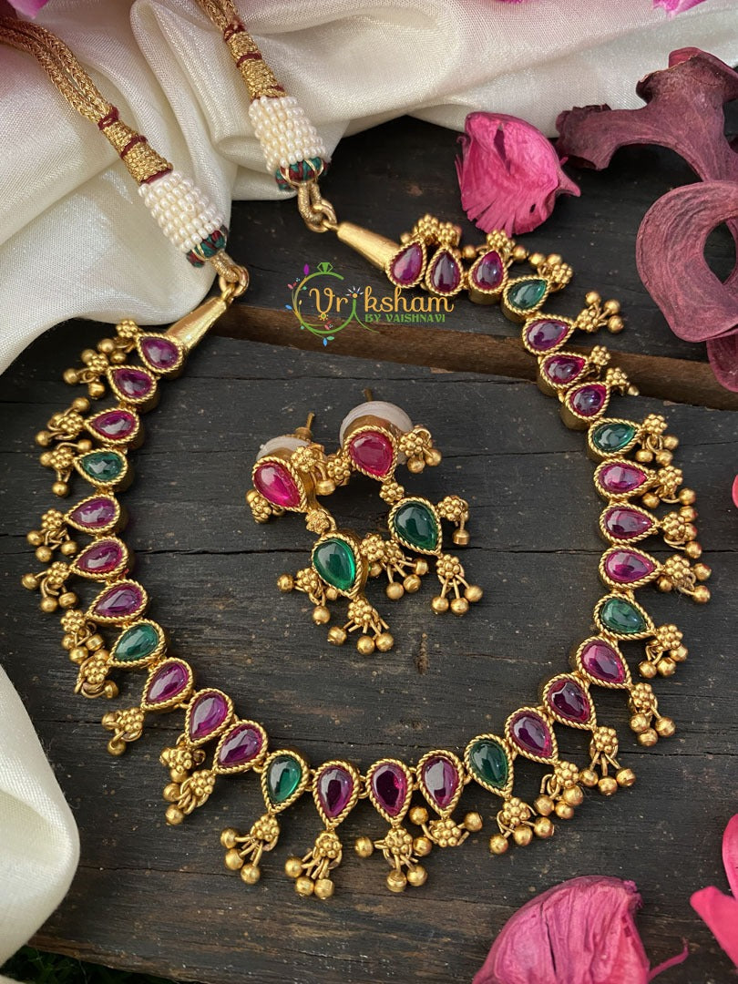 Simple Kemp Choker -Red Green -Red and green stone with tiny ghungroos style choker with earrings.