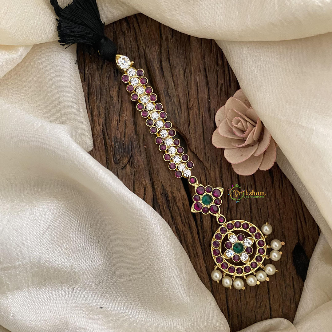 Upgrade your look with our Simple Kemp Mang Tikka-Pearl. This exquisite piece adds a touch of elegance and sophistication to any outfit, featuring beautiful kemp stones and a glistening pearl....