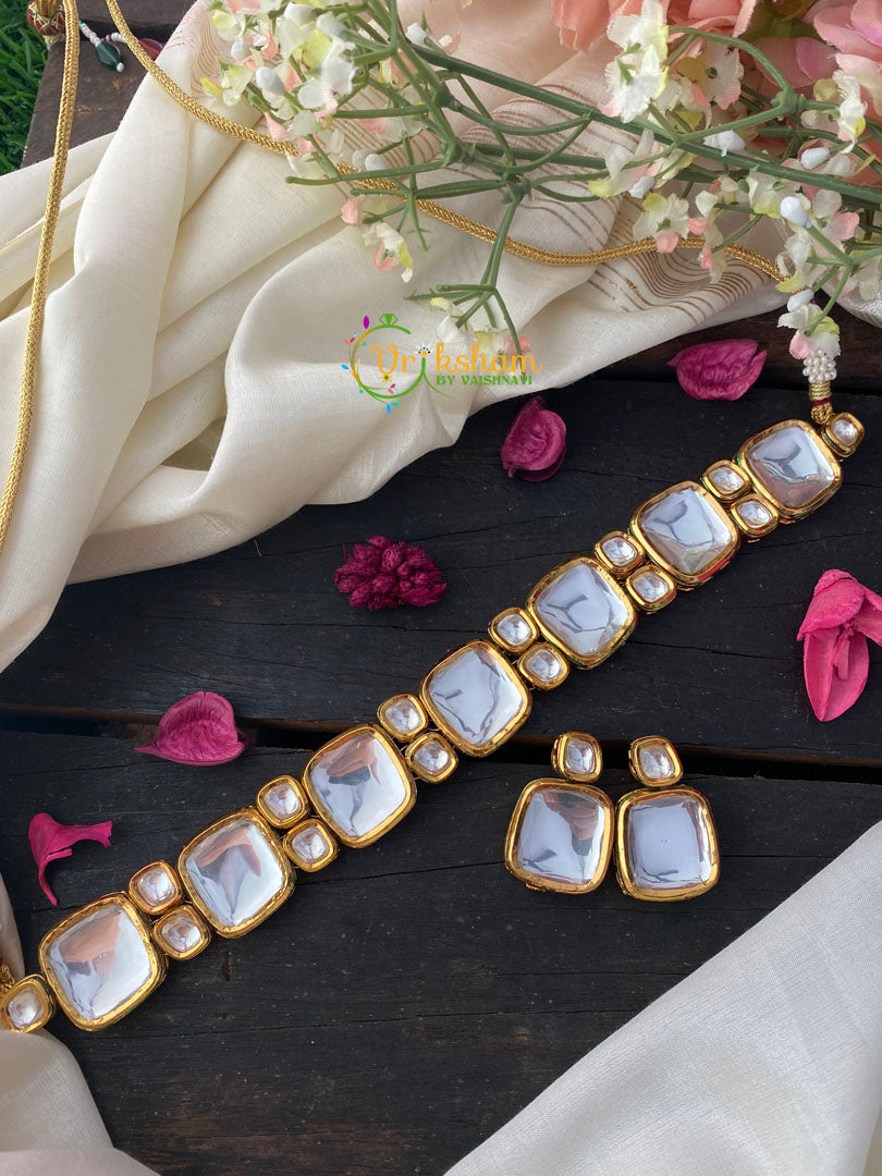 Exquisite Simple Kundan Short Neckpiece - single row small kundan; square geometrical kundan with dotted interludes; neckpiece with kundan ear studs.
